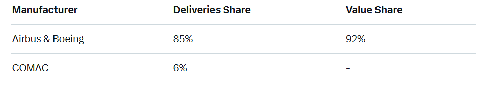 Airbus and Boeing dominate, while China’s COMAC gains ground with 6% of global demand.
