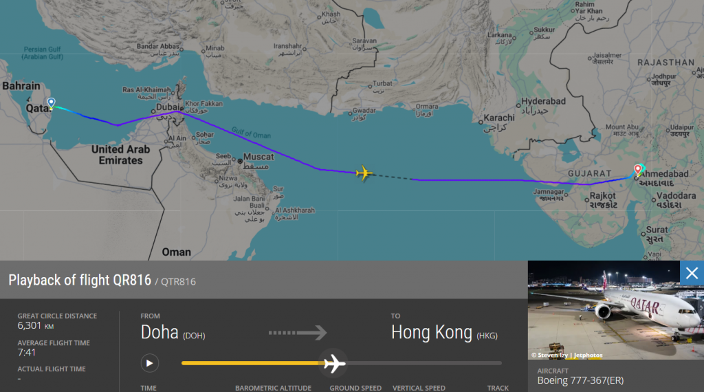 A Qatar Airways flight QR816, operated by a Boeing 777-300ER, was en route to Hong Kong International Airport (HKG).